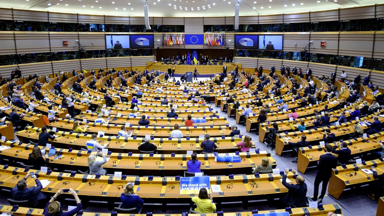 Ukrainian President Volodymyr Zelensky delivers a speech in front of the Assembly of the European Parliament on March 1, 2022 in Brussels, Belgium.